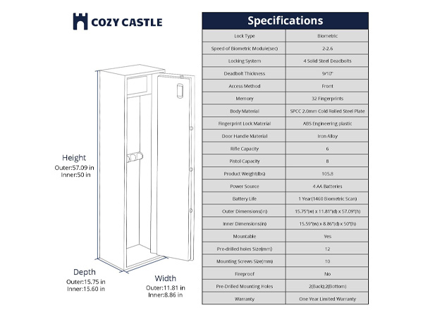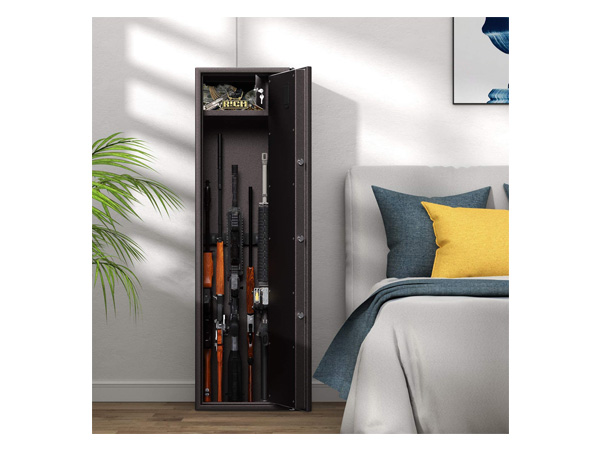 • Gran almacenamiento: el armario para armas cabe prácticamente en cualquier lugar para hasta 6 rifles de hasta 50.0 in con o sin miras. También tiene un casillero separado en el interior para contener hasta 8 pistolas, o para almacenar balas, dinero y otros objetos de valor en tu hogar u oficina. Dimensiones exteriores: 15.75 pulgadas (ancho) x 11.81 pulgadas (profundidad) x 57.09 pulgadas (alto).