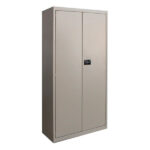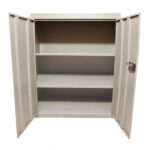 El cuerpo y las puertas son ensamblados mediante soldadura por resistencia. Cuenta con entrepaños fijos reforzados para mayor resistencia en cada división. Dos puertas abatibles, las puertas de los gabinetes se abren y cierran por medio de tres bisagras, cada puerta cuenta con 2 refuerzos verticales. Una puerta lleva su cerradura empotrada fabricada en plásticos ABS tipo paleta, incluye dos llaves y su estiradera. Medidas 87cm*37cm*120cm